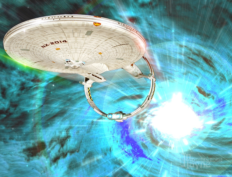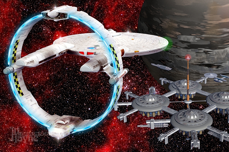 Mainzer arriving at a starbase in Andorian space for navigational trials. USS Potempkin has already arrived to supervise. Each of Mainzer's tail booms houses a separate matter/antimatter intermix chamber, each feeding power to warp coils in one half of the ring structure. |