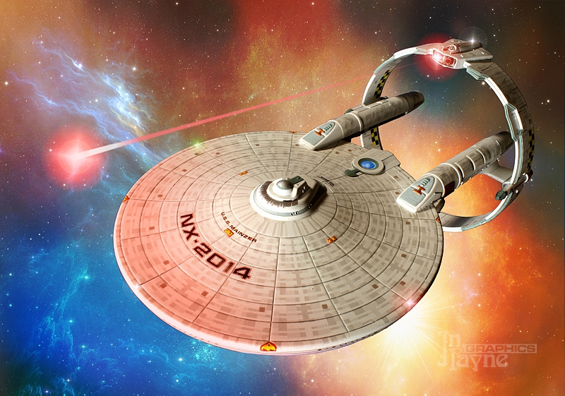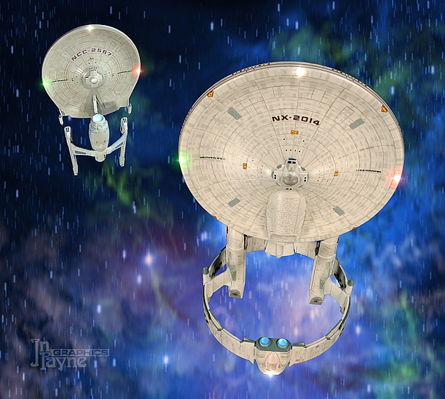 The model was created using Polar Lights' 1/1000 refit Enterprise saucer and a pair of "hyperspace rings" from Fine Molds' 1/72 Star Wars Jedi Starfighter, mounted together using fuel tanks from MPC's 1976 Space: 1999 Hawk kit. The torpedo pod is borrowed from Alliance's 1/1000 Reliant model. Other parts are various spare model kit parts. |