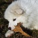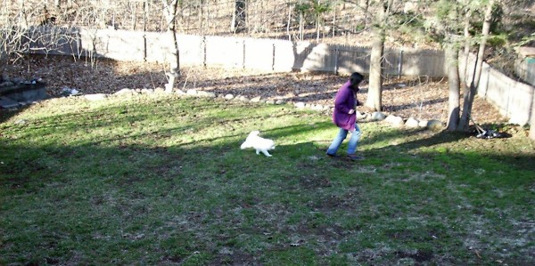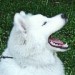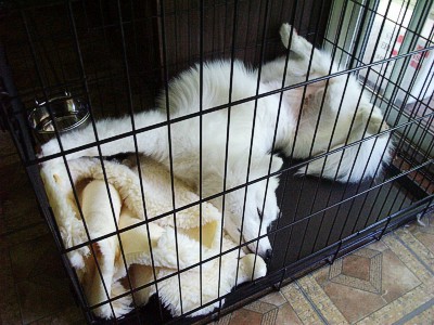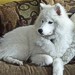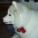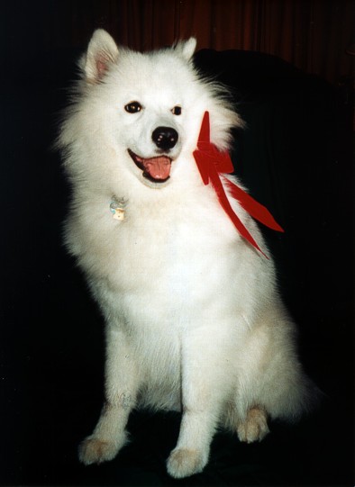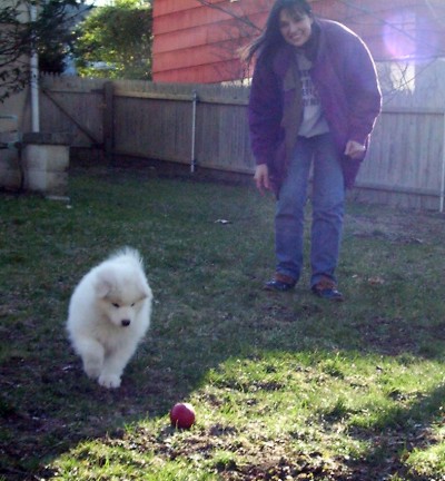 Less exciting events in her life as time goes by. In August she got to stay with her "real" family for four days while we were on vacation. We only got one picture out of it since it was impossible to get her and her sister, Feather, to stand still for a portrait. (note also that white dogs don't photograph well with a disposable flash camera!)