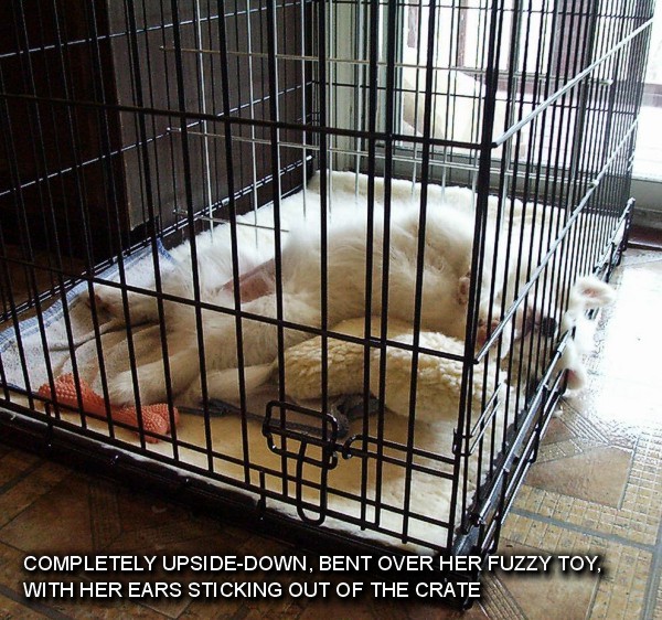 In July we traumatized the poor thing by getting her spayed. She hid under the table for 2 days, standing there, stoned out of her tiny little mind. And she continues to find interesting positions to sleep in.