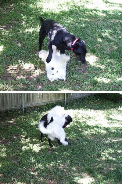 By late May she's had all her shots and she's out in the world meeting people. We got her together with our friends' dog tess, and they get along like littermates. Mary's started her obedience training, and she already walks on a leash like a perfect little lady (until you meet another dog, anyway). The right ear is almost erect. It pops right up there when you say the word "food," though!