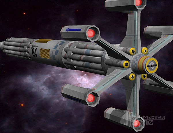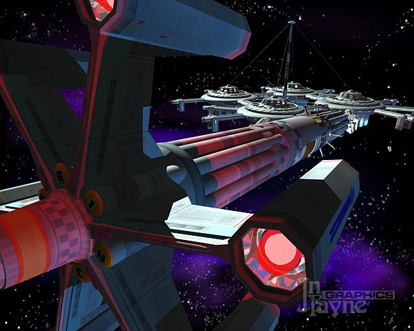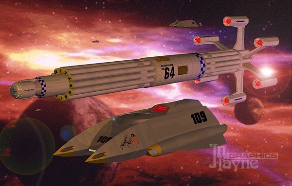 rendering in Caligari Truespace. The tubes around the hull are launch catapult tubes for the ships'